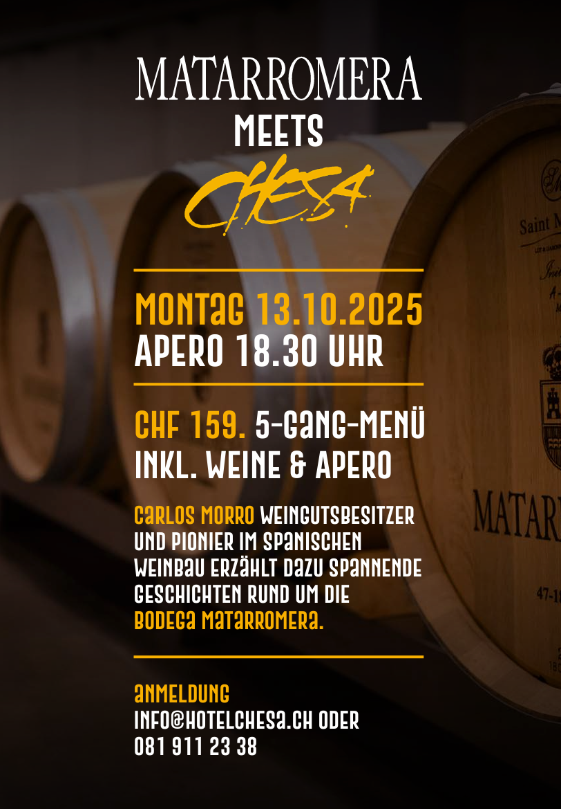 Ob am Mittag, am Abend oder zu einem speziellen Anlass – wir laden zum Geniessen und Verweilen ins Hotel Chesa ein. Gerne verwöhnen wir Sie mit Köstlichkeiten aus unserer Küche sowie edlen Tropfen aus unserem erlesenen Weinkeller.
